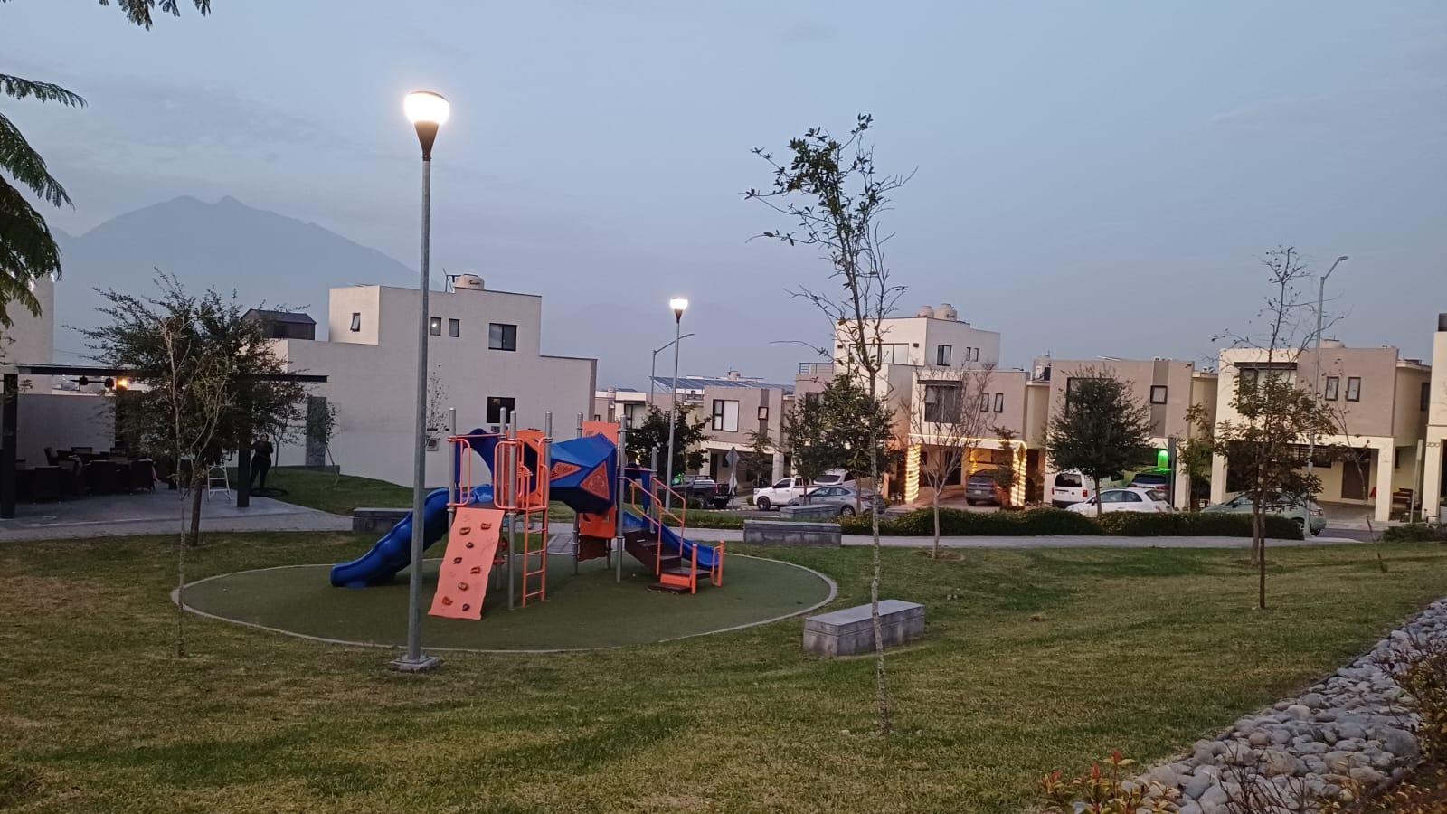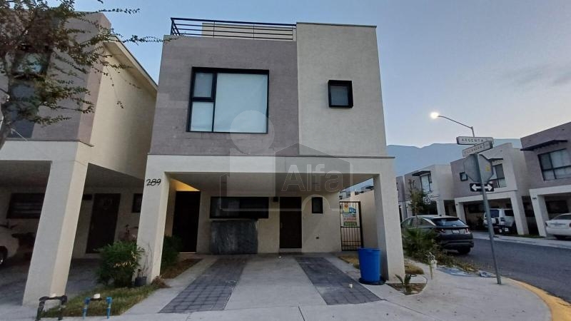 Casa en venta o renta en el Fraccionamiento Ferrara, García, Nuevo León. Ubicada en esquina dentro de una privada con excelentes amenidades como alberca y dog park, caseta de vigilancia las 24 horas. La propiedad se distribuye en tres niveles y ofrece espacios amplios y bien iluminados.
